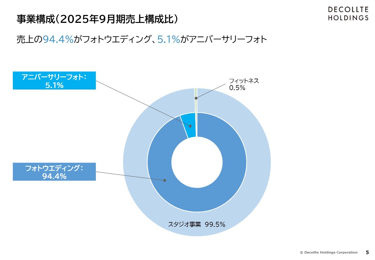 新井:当社の事業概要についてです。当社の事業は、フォトスタジオを運営するスタジオ事業とフィットネス事業の2つに分かれています。このうち、フォトウエディングが全体の94パーセント、アニバーサリーフォトが5パーセントを占めており、フォトウエディングが主力事業となっています。