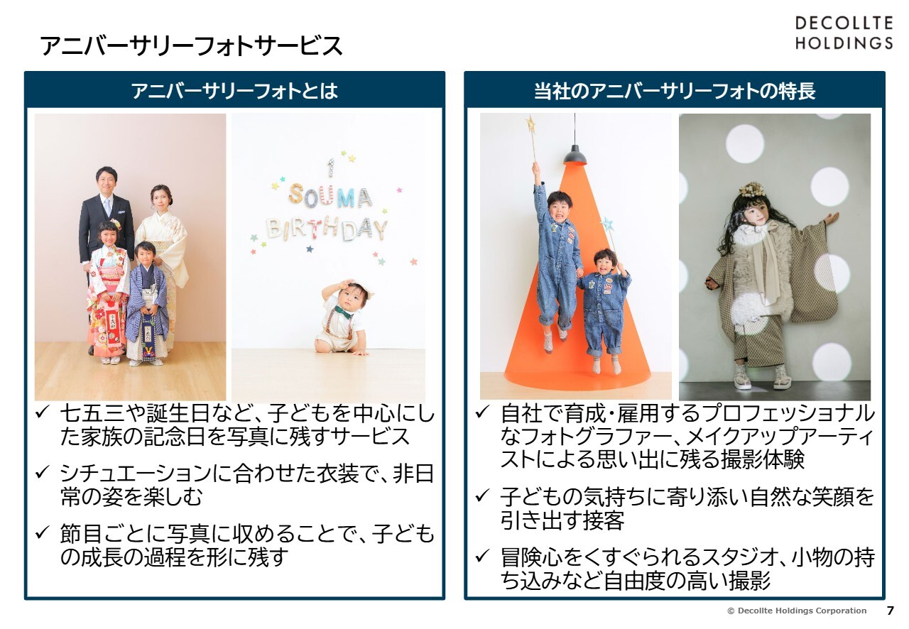 新井:アニバーサリーフォトサービスは、子どもを中心とした家族の記念日を写真に残すサービスです。七五三や誕生日など、シチュエーションに合った衣装で非日常の世界を楽しんでいただき、節目ごとに写真に収めることで子どもの成長の過程を形に残せるサービスを提供しています。