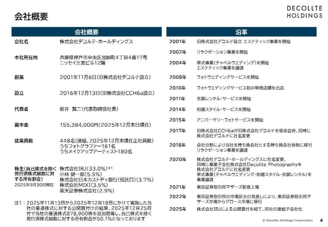 新井:カンパニー・ハイライトからご説明します。当社は、兵庫県神戸市に本社を構え、2001年に創業しました。従業員数は約450名です。株主構成については、昨年12月に株式会社IBJによるTOBを実施し、現在はIBJが50.1パーセントを保有する連結対象子会社となっています。