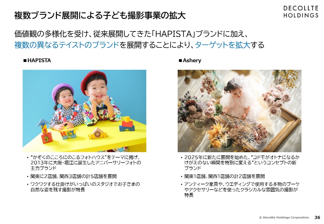 新井:アニバーサリーフォトの施策についてご説明します。当社は「HAPISTA」というブランドを展開してきましたが、昨年から複数ブランド化を目指し、「Ashery」というブランドもスタートしました。