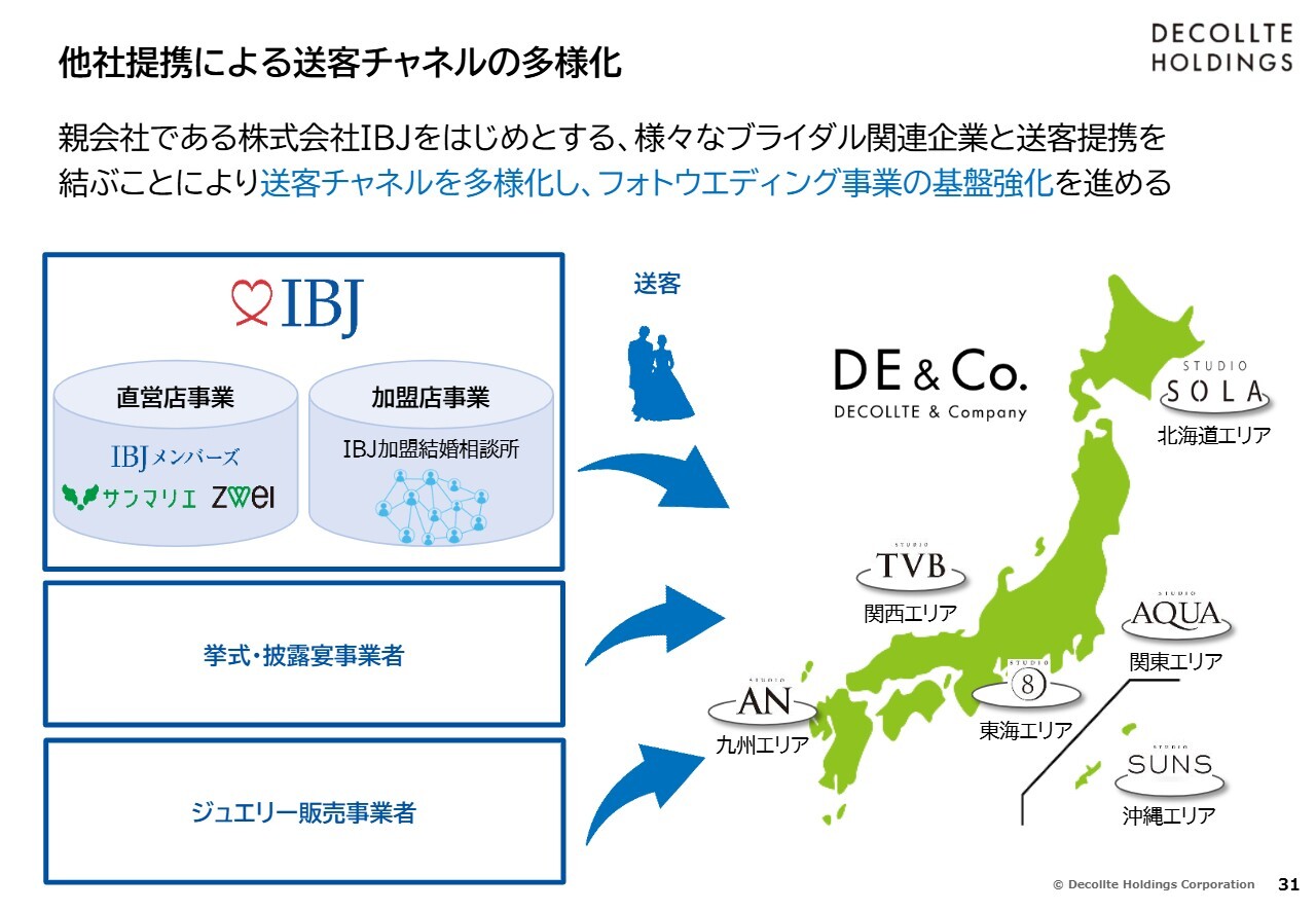 今後、日本の婚活サービスの最大手である親会社IBJからの結婚を決意された方々の送客は、非常に大きな力になると考えています。IBJだけでなく、挙式・披露宴事業者やさまざまな会社とも送客の提携を結んでいます。