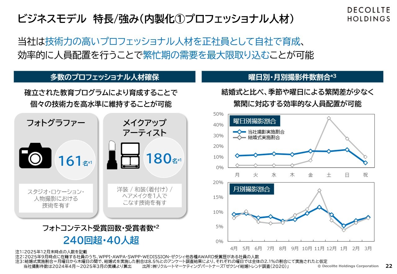 スライド下部に記載した撮影に関わるプロフェッショナル人材、撮影用衣装・設備備品等、そしてWebマーケティングを内製化していることも、非常に大きな強みだと考えています。
