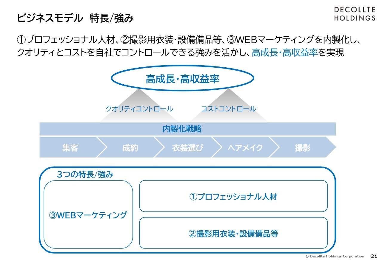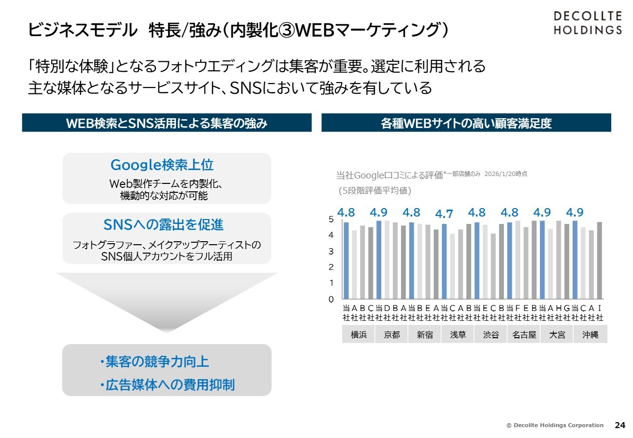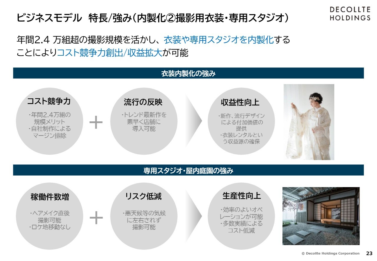 その上で、内製化に関して、人材、衣装、Webマーケティングなどを非常に効率的に活用し、収益を着実に生み出す体質を構築していることが要因だと思います。