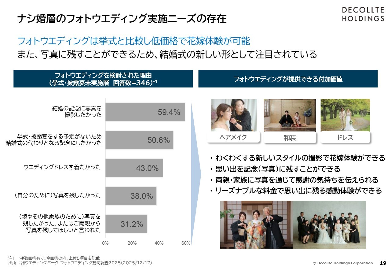 今後、非常に重要性を増していくと考えているのが、現在「式なし、フォトなし」という状況に該当する15万4,000組です。この多数を占める層に対して、当社のような事業者がどのようにフォトウエディングの魅力や価値観を伝えていけるかが、市場拡大の大きな鍵になると考えます。
