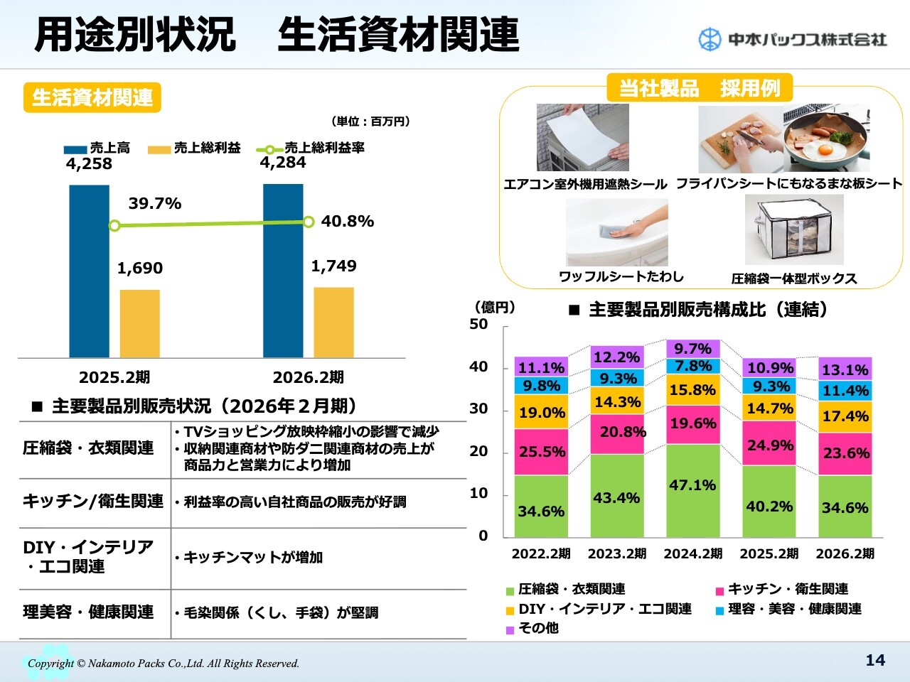 生活資材関連です。売上高は42億8,400万円、売上総利益は17億4,900万円で、前期比0.6パーセントの増収、3.5パーセントの増益となりました。利益率の高い自社商品の販売が好調だったことや、収納関連商材や防ダニ関連商材など付加価値の高い商材の売上が増加しています。