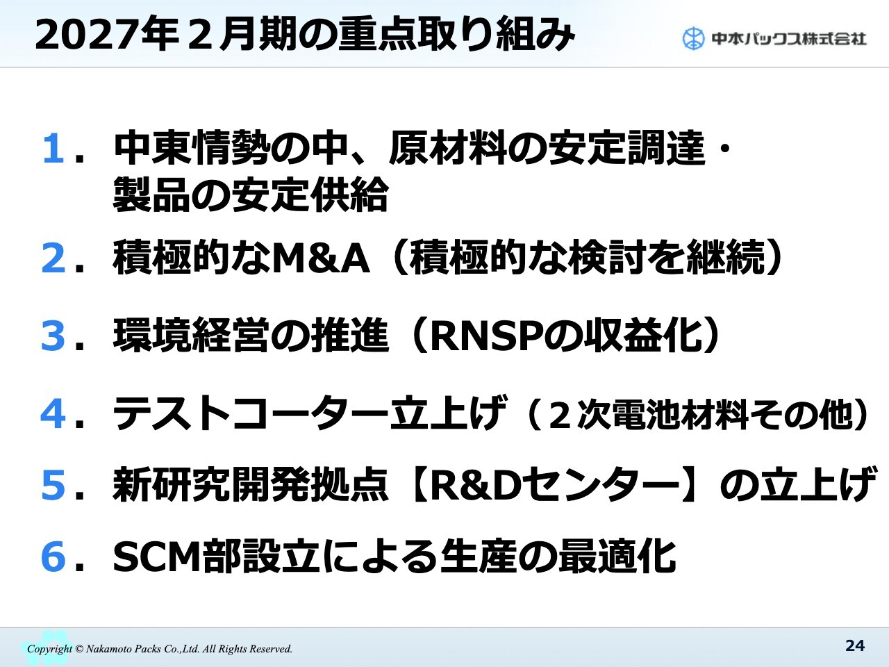 1つ目は、中東情勢の影響を受ける中での原材料の安定調達です。安定調達した材料を基に、お客さまへ製品を安定供給し、製品の欠品を防ぐことに集中して取り組んでいきます。