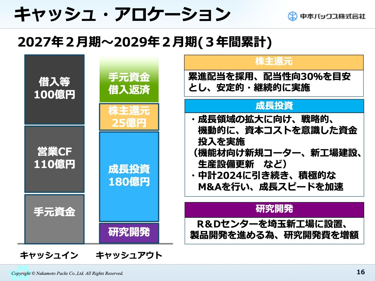 2027年2月期から2029年2月期の3年間で、営業活動によるキャッシュ・フローを110億円と見込んでいます。借入と手元資金を合わせ、スライド右側に示した成長投資に180億円、株主還元に25億円、研究開発投資の3つに、合計で約200億円以上を充てていく方針です。