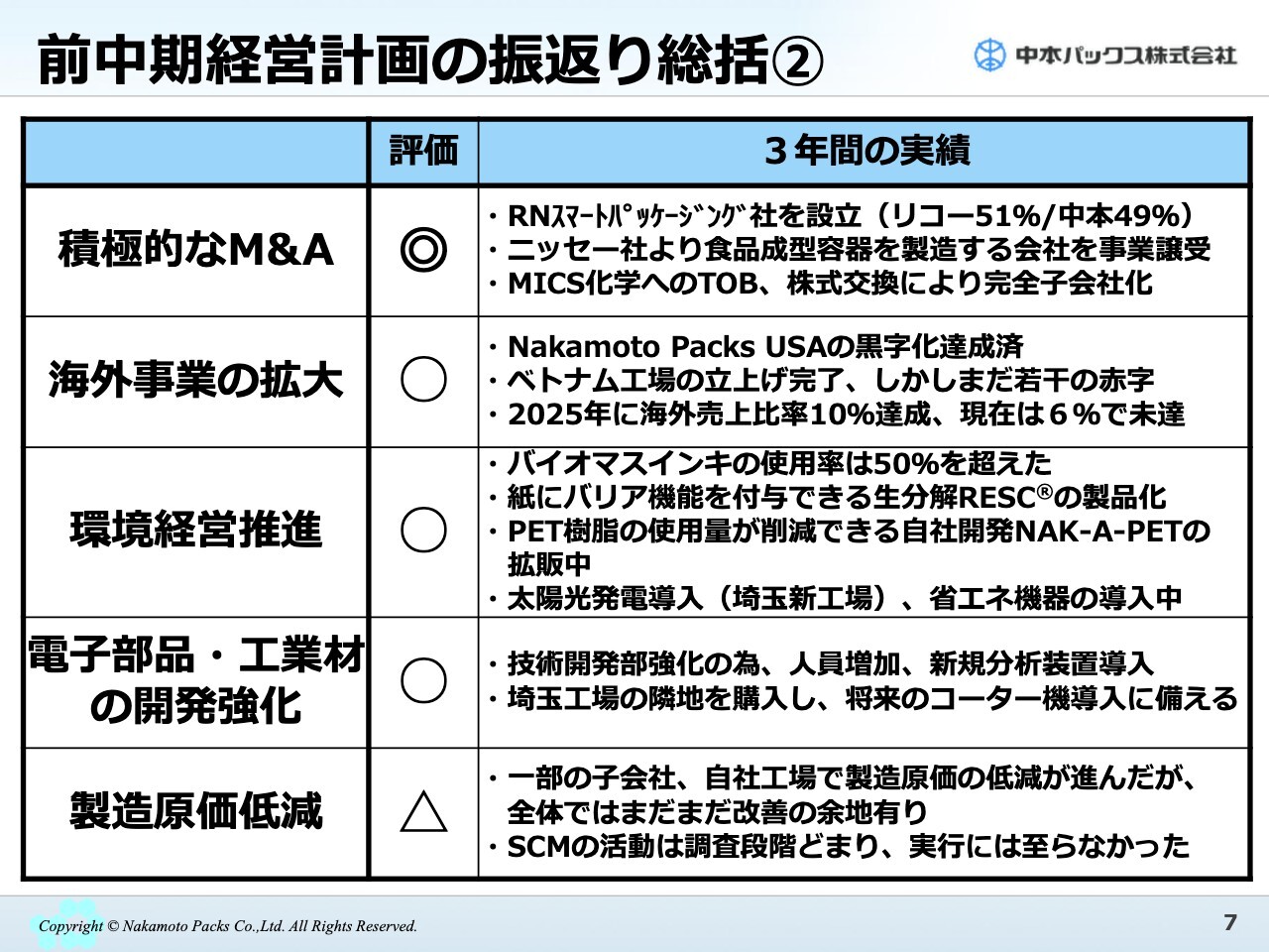 一方で、2025年に海外売上高比率10パーセントを達成しましたが、現在は6パーセントであるため、「◎」ではなく「〇」としています。この原因として、昨年10月に中国の蘇州工場と廊坊中本包装を含む会社を売却したことで、売上計上がなくなったことが挙げられます。