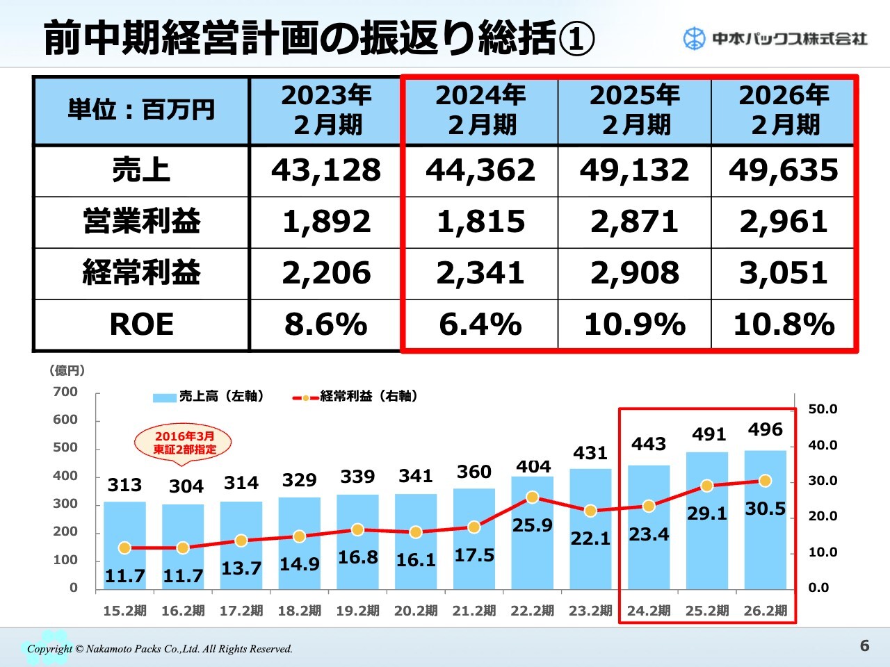 前中期経営計画の振り返りと総括についてです。2024年2月期の売上高は443億6,200万円、経常利益は23億4,100万円でした。特に大きく伸びたのが2025年2月期で、この成長は2024年に実施したM&Aによる利益貢献や機能材の復活が主な要因です。