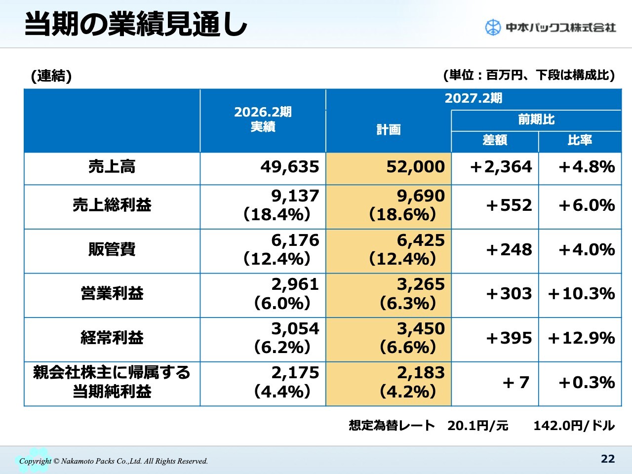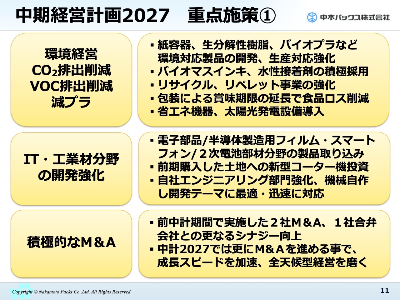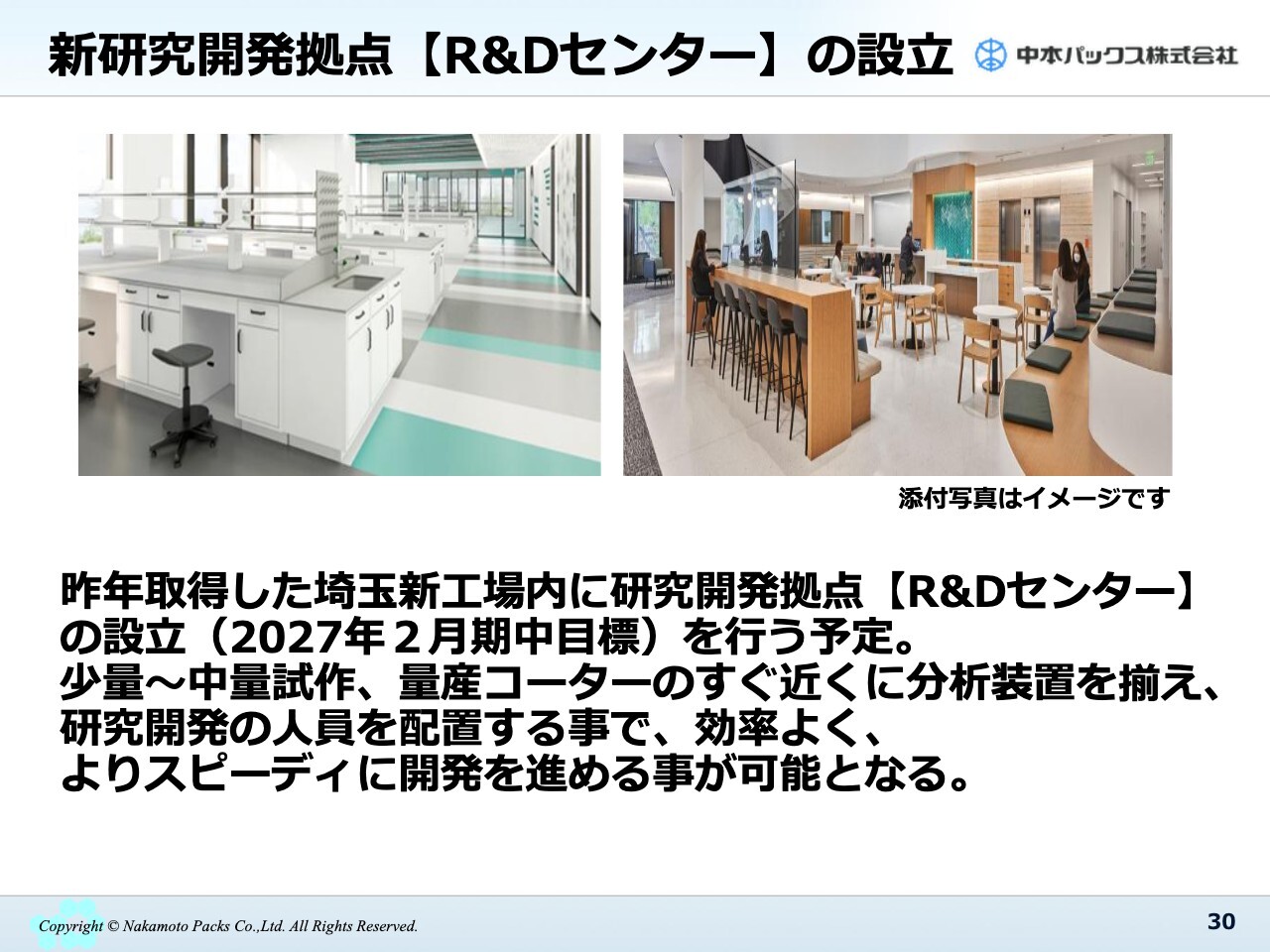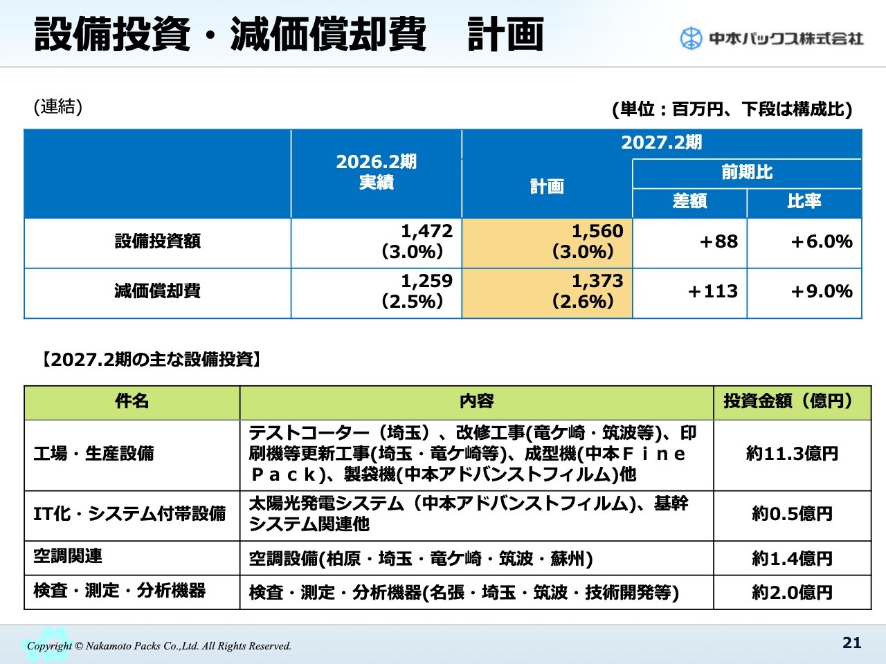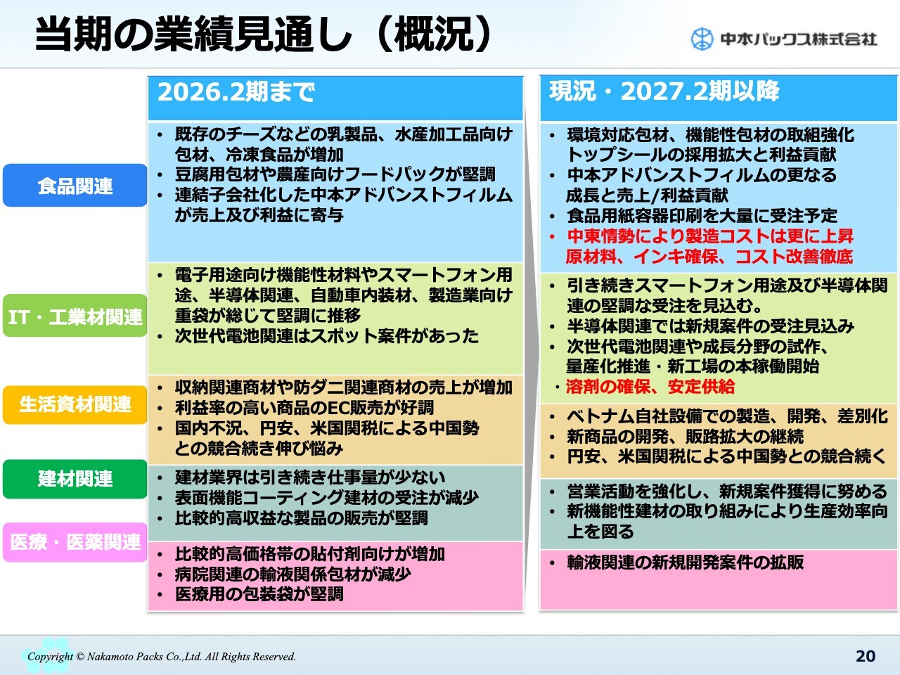 中本アドバンストフィルムの売上および利益貢献も見込んでいます。冷凍弁当で採用されたラベルレスサーマルトップシールや「RESC」をはじめとする環境対応包材の受注増加も見込んでいます。