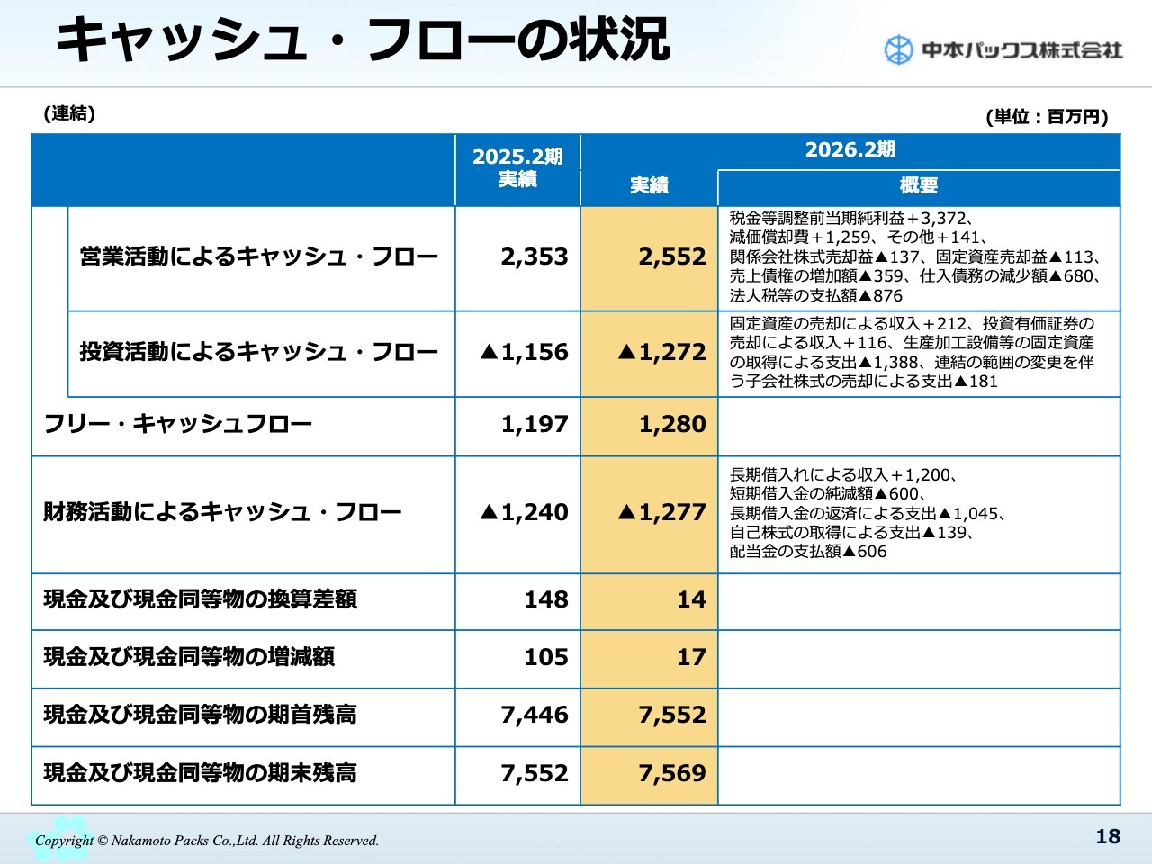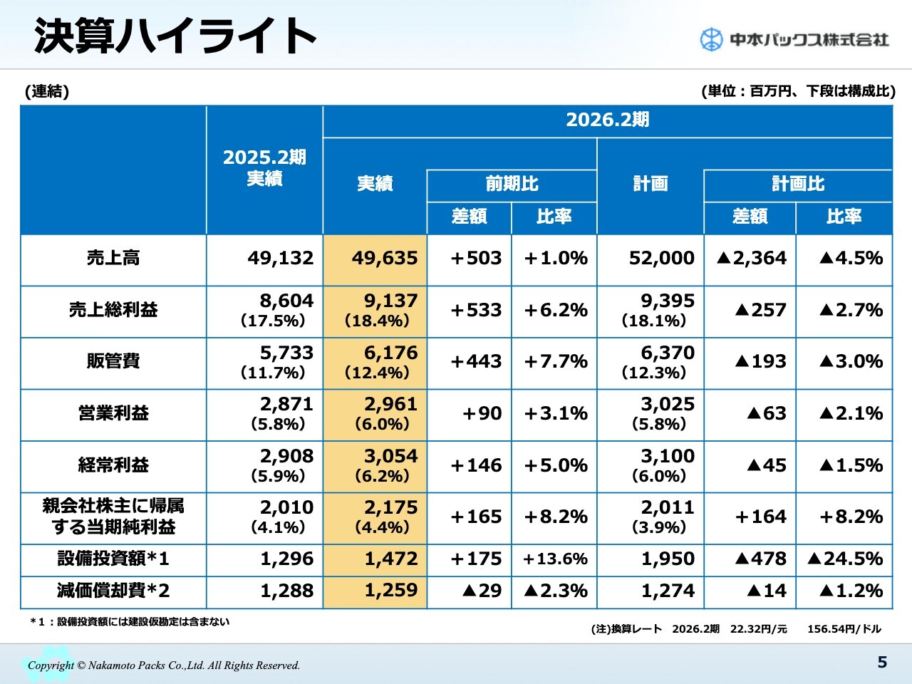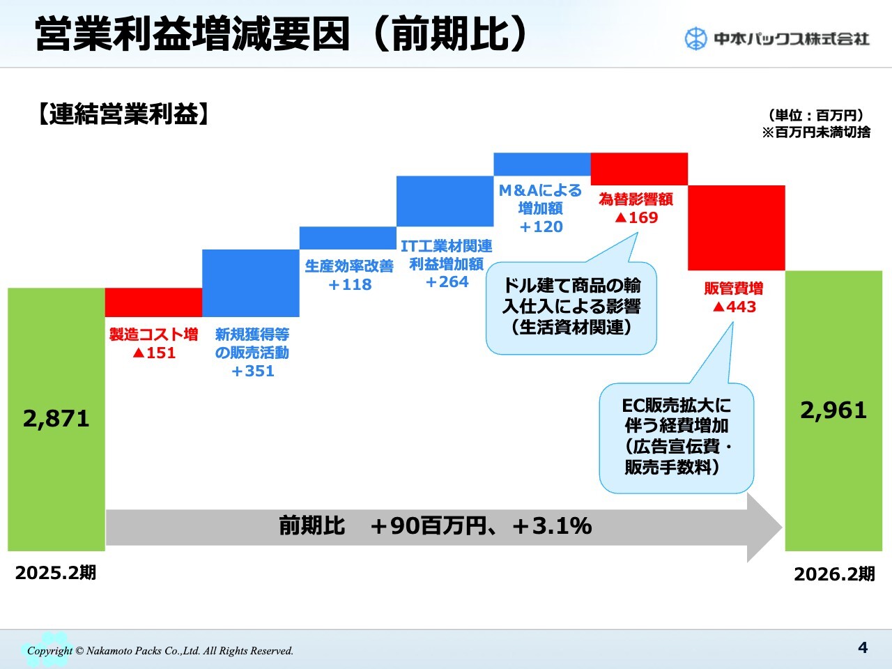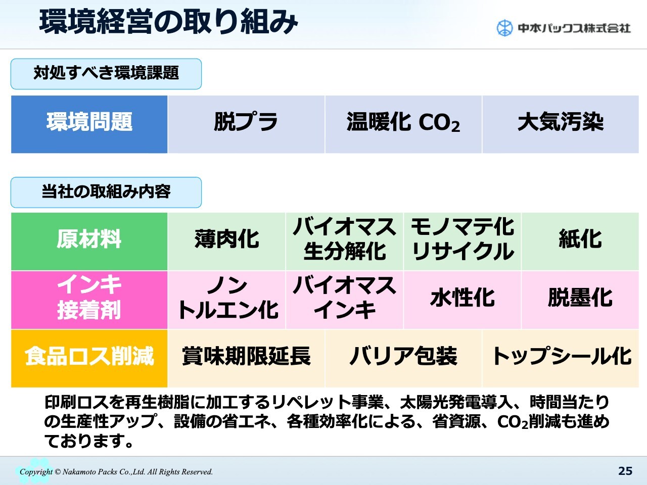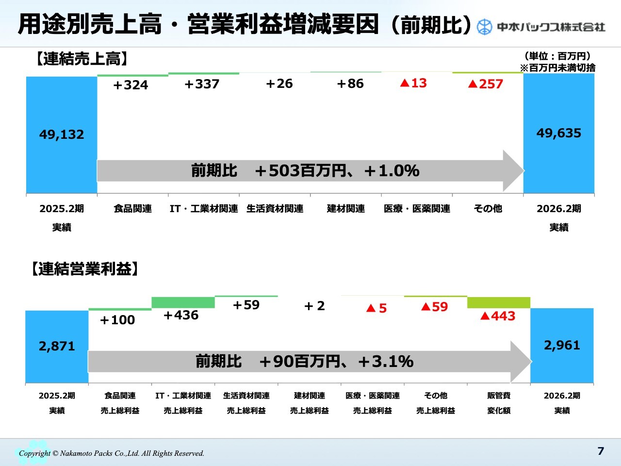 中本アドバンストフィルムの売上および利益貢献も見込んでいます。冷凍弁当で採用されたラベルレスサーマルトップシールや「RESC」をはじめとする環境対応包材の受注増加も見込んでいます。