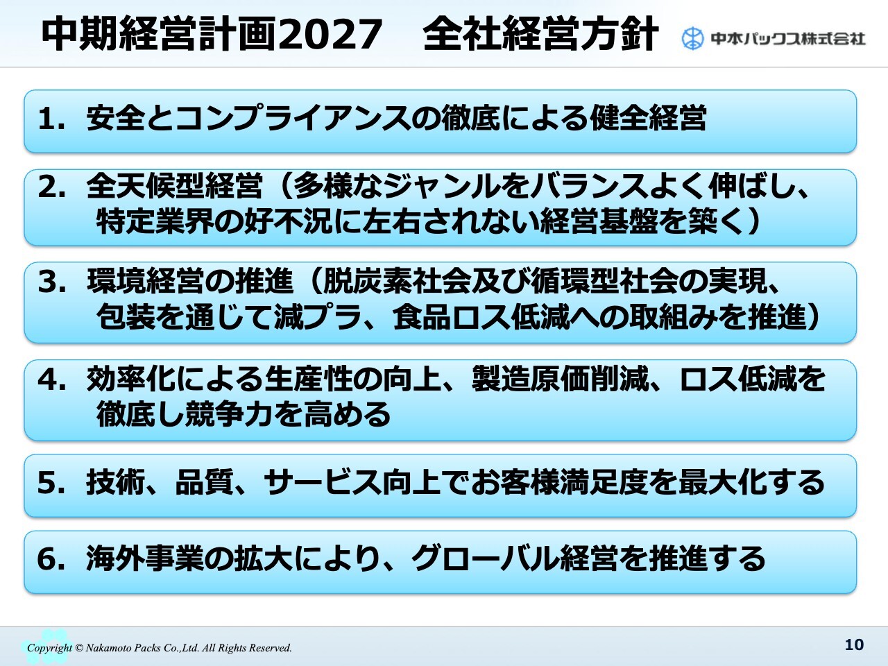 スライドには、全社経営方針を記載しています。「中期経営計画2024」とほとんど変更がないため、詳細なご説明は省略します。
