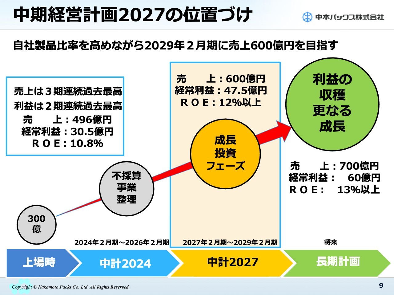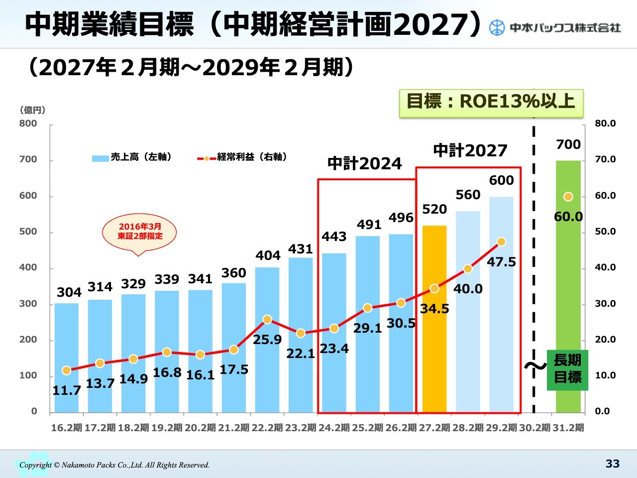 「中期経営計画2027」は、成長投資のフェーズと位置づけています。新しい工場の建設や、コーターの導入などを進めることで、売上高600億円、経常利益47億5,000万円、ROE12パーセント以上を目標とします。