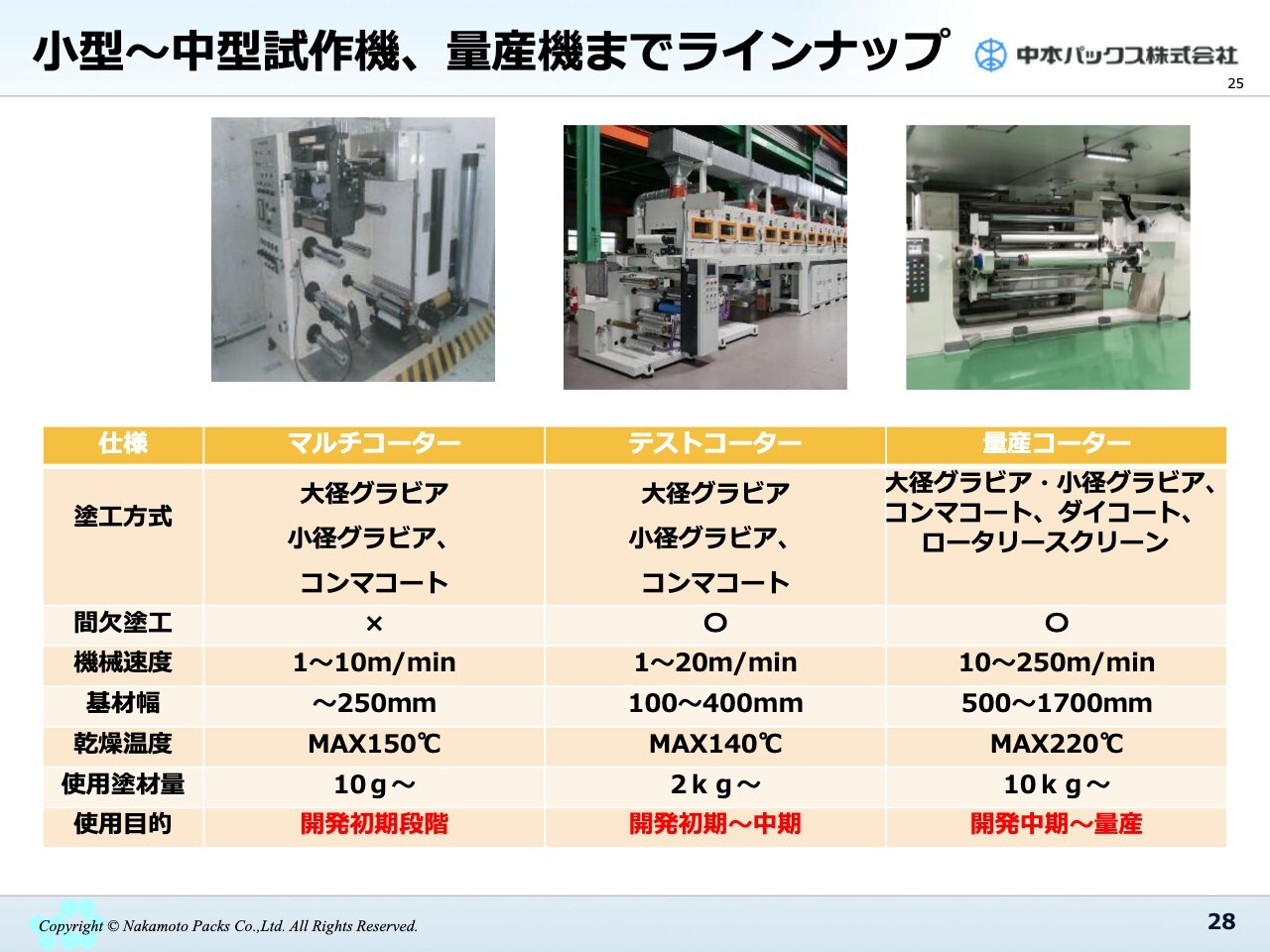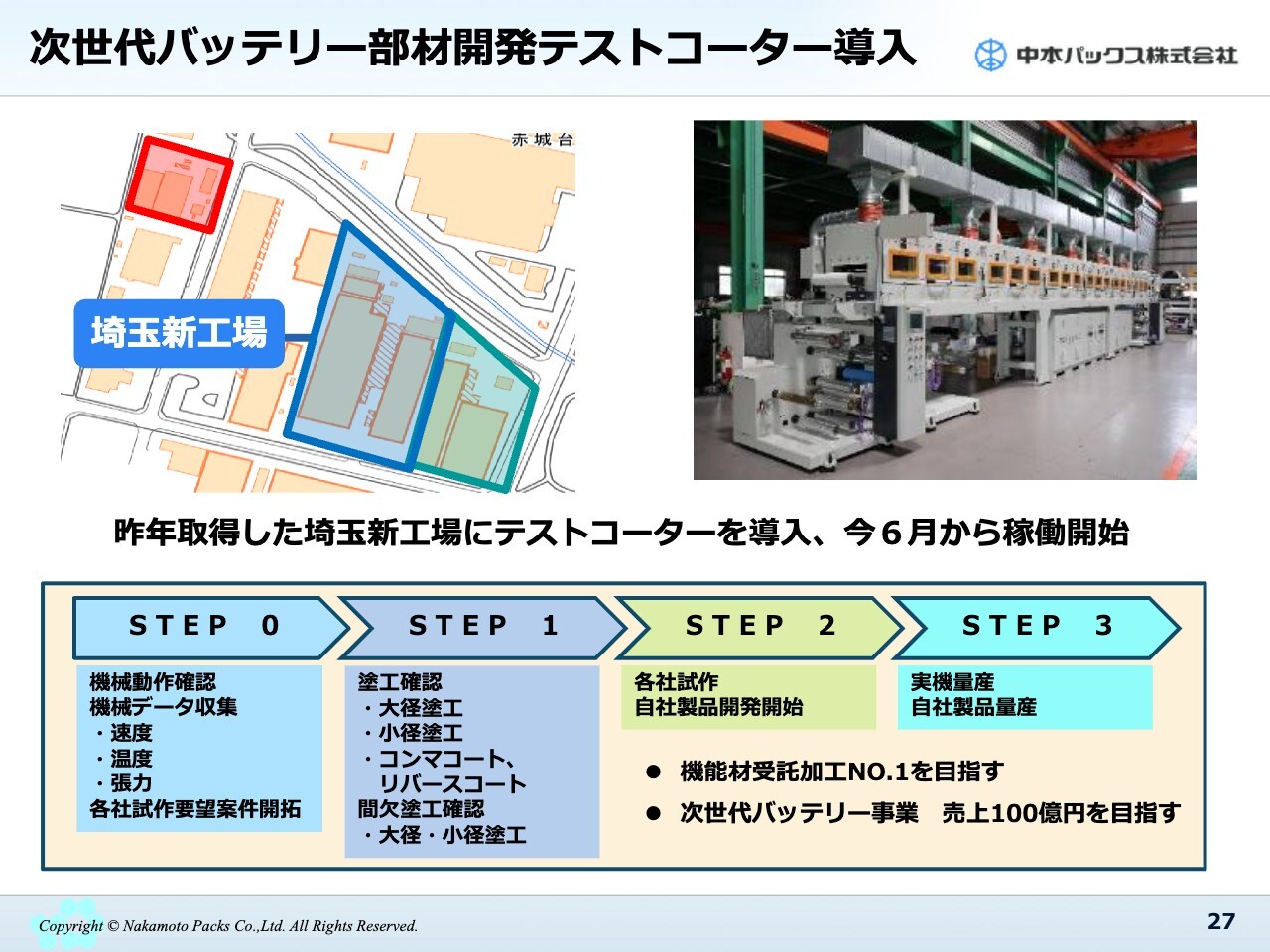昨年取得した埼玉新工場については、昨年からテストコーターを導入する計画をお伝えしていましたが、今年6月から稼働開始となります。現在、スライドの写真にあるテストコーターの導入作業を進めている最中です。