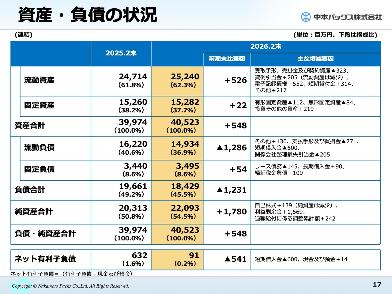 資産および負債の状況について、ポイントを簡単にご説明します。2026年2月末の資産合計は405億2,300万円でした。現金および預金、電子記録債権、自己株式などが増加し、前期末比で5億4,800万円増加しています。