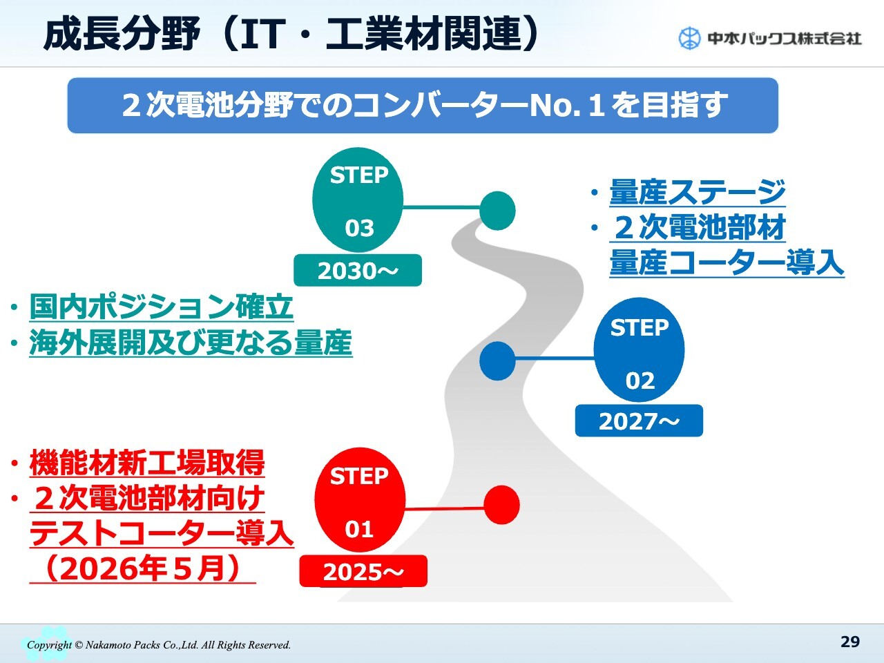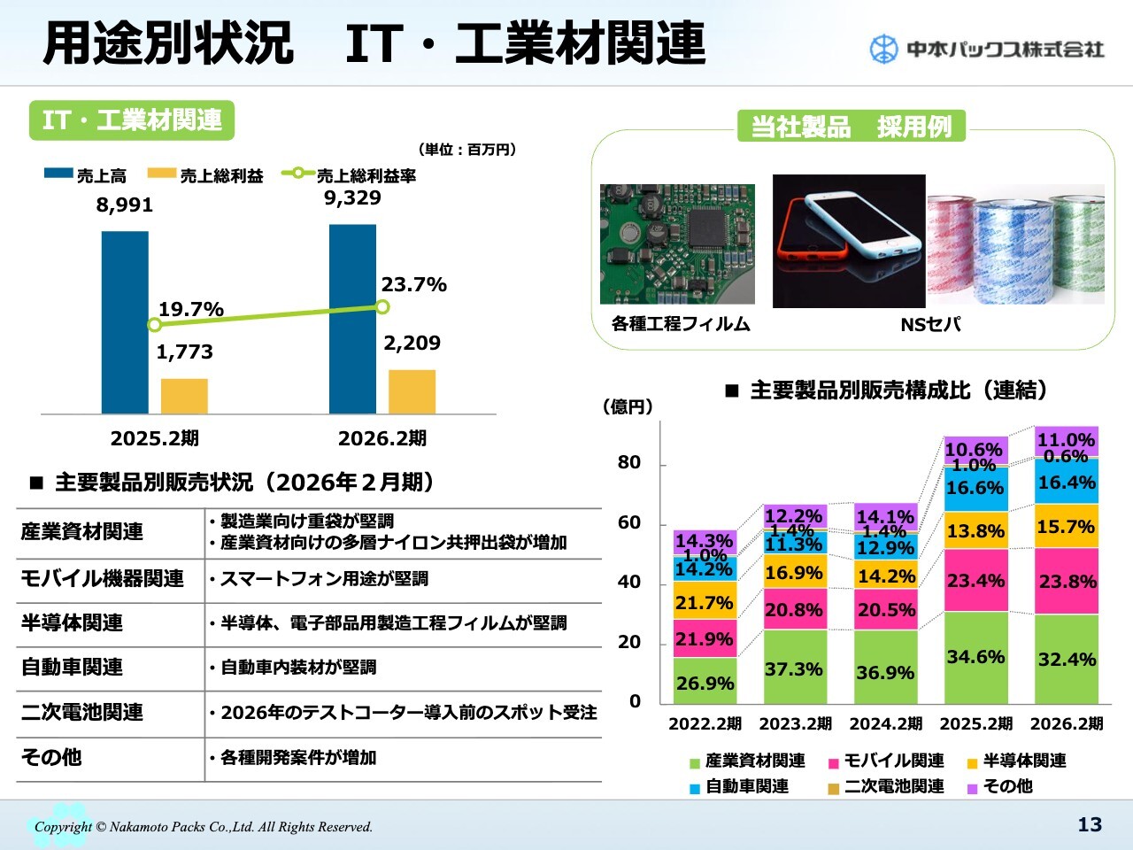 IT・工業材関連については、3期連続で好調が続いており、引き続き半導体関連の堅調な受注を見込んでいます。次世代電池などの成長分野におけるスポット案件もあり、新工場の本稼働に向けた取り組みを強化していきます。