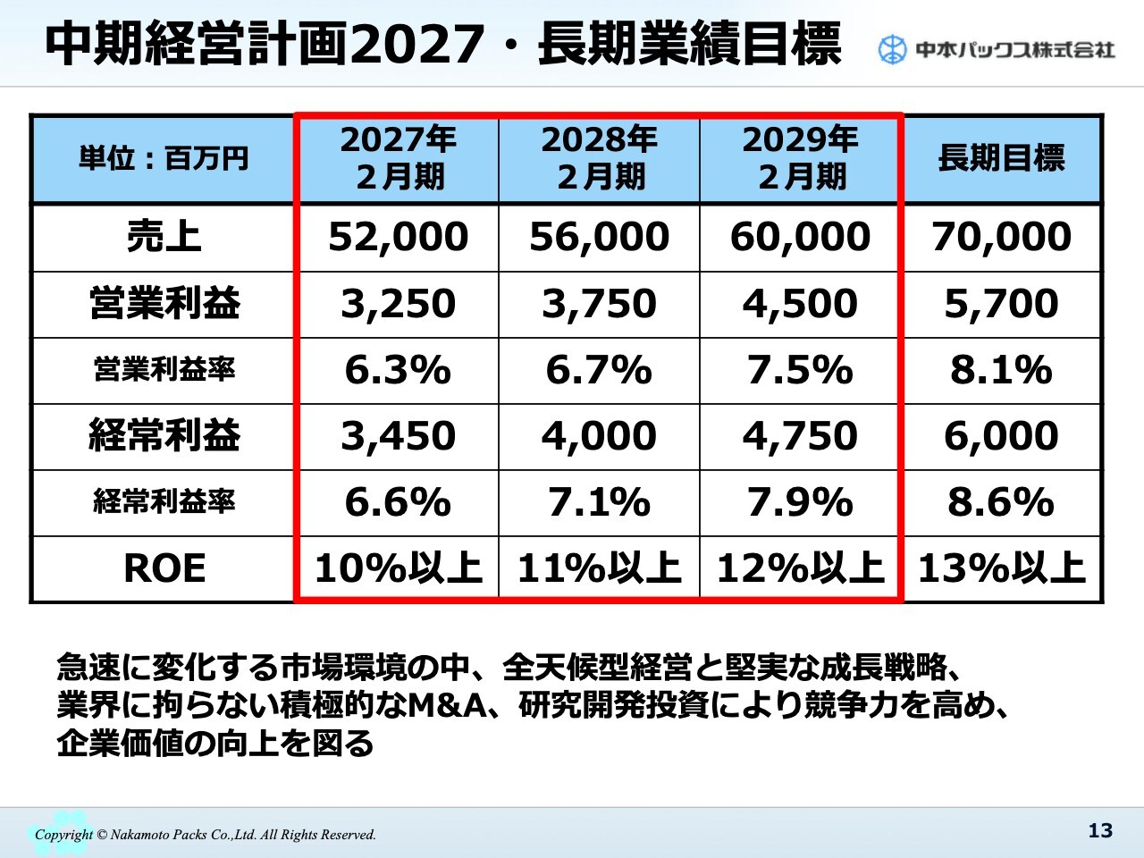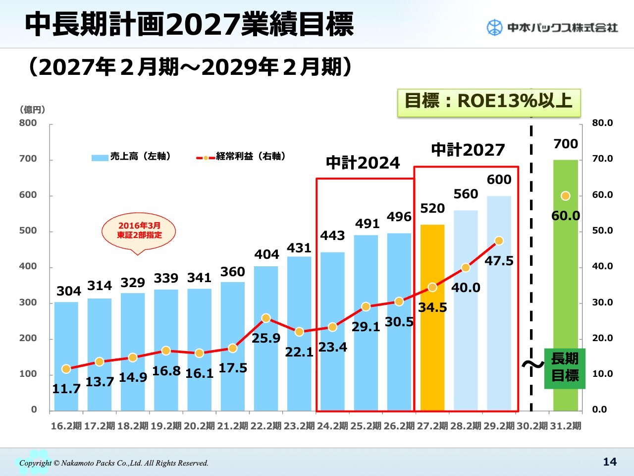ここでの投資を基盤として、長期計画では「利益の収穫 さらなる成長」を掲げ、売上高700億円、経常利益60億円、ROE13パーセント以上を目指していきます。
