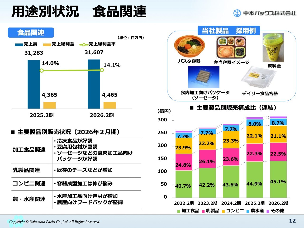 既存のチーズや冷凍食品、水産加工品向けの包材が好調に推移しています。豆腐用包材や農産向けフードパックも堅調に推移しました。