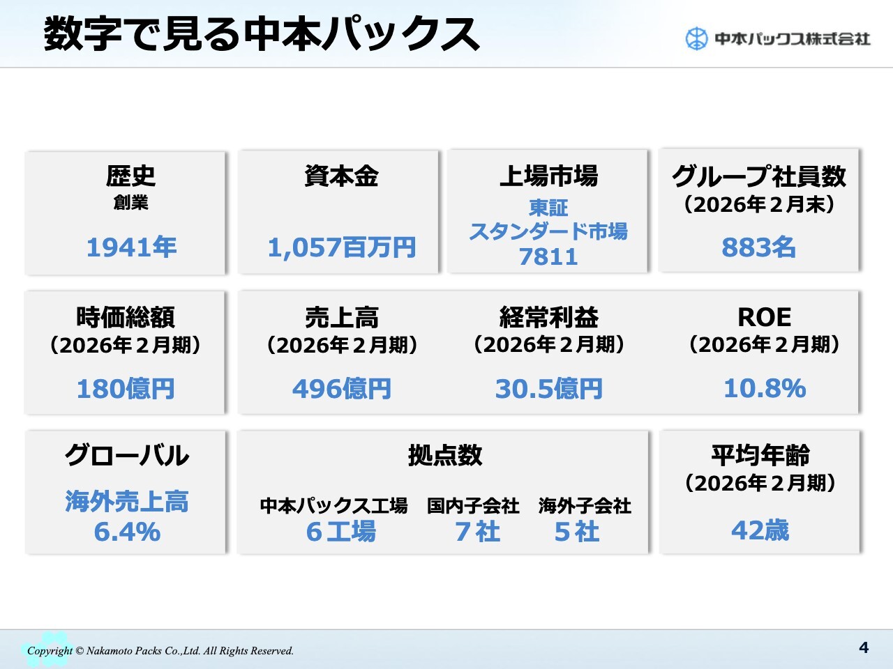 数字で見る中本パックスについてです。当社は、今年で創業85周年を迎え、1941年に創業しました。社員の平均年齢は42歳です。その他の数字についてのご説明は割愛します。