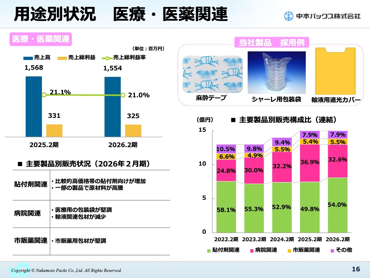 医療・医薬関連です。売上高は15億5,400万円、売上総利益は3億2,500万円で、前期比0.9パーセントの減収、1.6パーセントの減益となりました。比較的高価格帯の貼付剤関連が増加した一方で、病院関連の輸液関連包材が減少し、この数値となっています。
