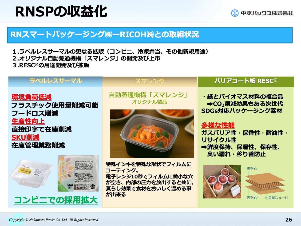 今年、2023年にリコーと共同で設立した会社であるRNスマートパッケージングの収益化を考えています。ちょうどこの3月で決算を迎えますが、今期の見込みとして、RNスマートパッケージングはほぼ収支が均衡すると予想しています。