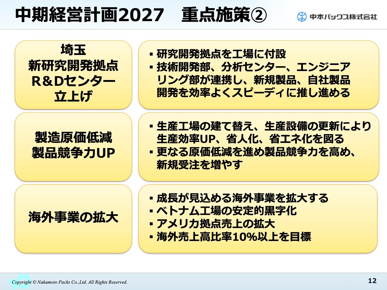 重点施策②についてです。IT・工業材関連を成長させるため、研究開発拠点であるR&Dセンターの立ち上げを掲げています。製造原価の低減や製品競争力の向上、海外事業の拡大も進めていきます。