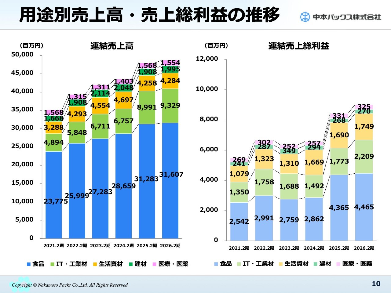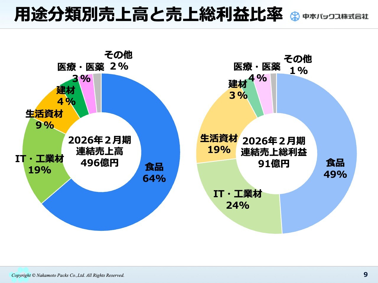 スライドは、用途別の売上高および売上総利益の比率を示したものです。売上高では、食品関連が64パーセント、IT・工業材関連が19パーセント、生活資材関連が9パーセントと続いています。引き続き、食品関連は売上が安定しており、当社の安定した業績の基盤となっています。
