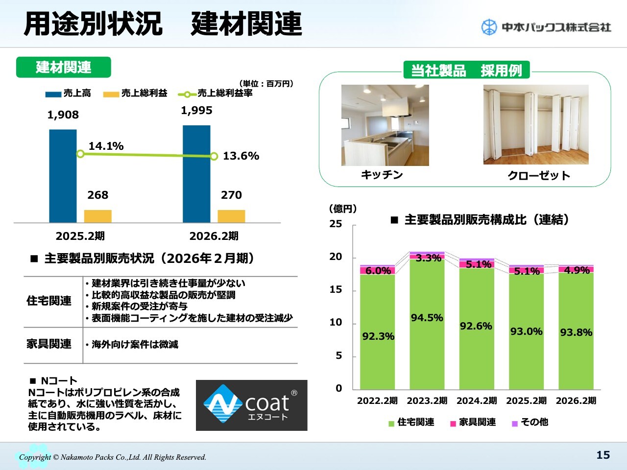 表面機能コーティングを施した建材の受注は減少していますが、新規案件の受注が寄与しています。しかし、建材業界は引き続き仕事量が少ない状況にあるため、営業活動を強化していきます。