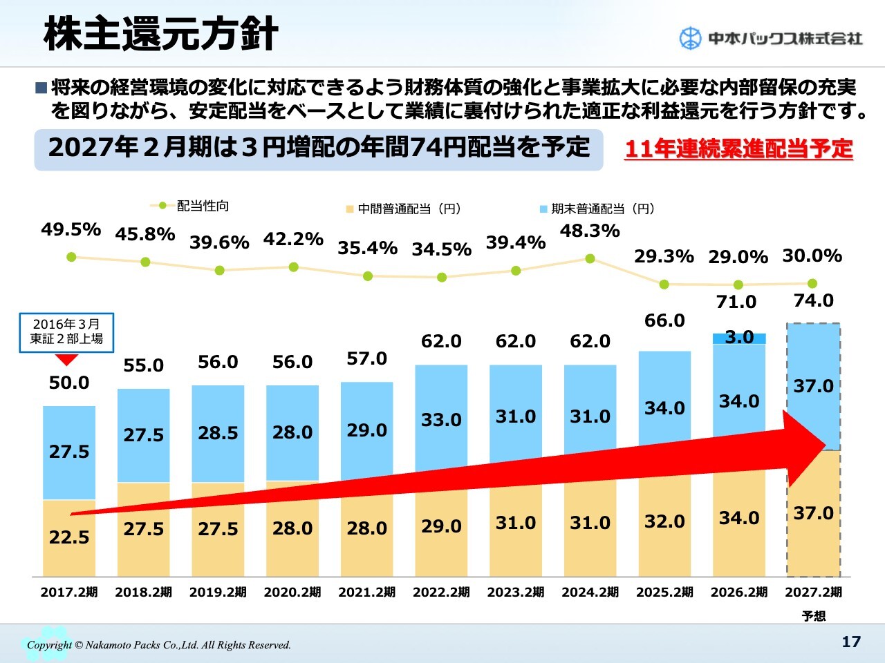 株主還元方針についてです。2026年2月期においては、後半に2回の配当を行い、3円の増配を実施しました。合計で71円の配当となり、増配を発表しています。