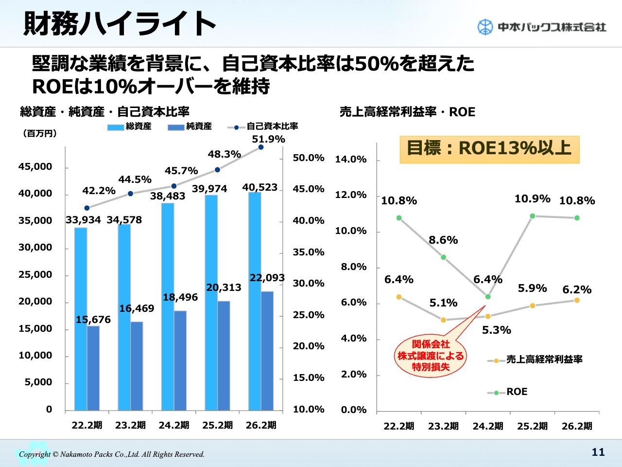 財務ハイライトについてご説明します。堅調な業績を背景に、自己資本比率は50パーセントを超えて51.9パーセントとなりました。目標としているROE13パーセント以上については、若干下がったものの、10.8パーセントを維持しています。