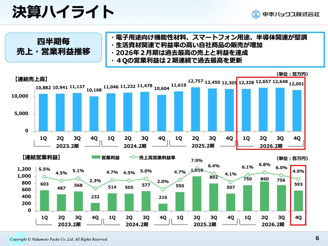 四半期ごとの売上高と営業利益の推移についてご説明します。電子用途向け機能性材料やスマートフォン用途、半導体関連が好調でした。生活資材関連では、利益率の高い自社製品の販売が増加しました。その結果、2026年2月期には過去最高の売上高と利益を達成しました。