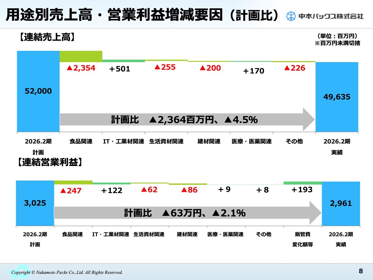 用途別の売上高・営業利益を計画と比べた増減要因についてご説明します。食品関連の無地化の影響でコンビニ関連が計画を下回って推移した一方、IT・工業材関連や医療・医薬関連は若干伸びましたが、計画比マイナス6,300万円で推移しています。