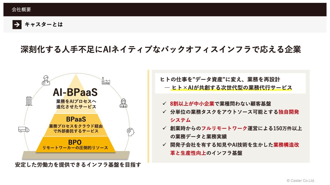 会社概要のまとめです。当社は深刻化する人手不足に対して、AIネイティブなバックオフィスインフラで応える企業です。これまで当社は、リモートワーカーの豊富なリソースと分単位の業務タスクをアウトソース可能にする独自開発システムを強みに、中小企業をメインに顧客基盤を構築してきました。