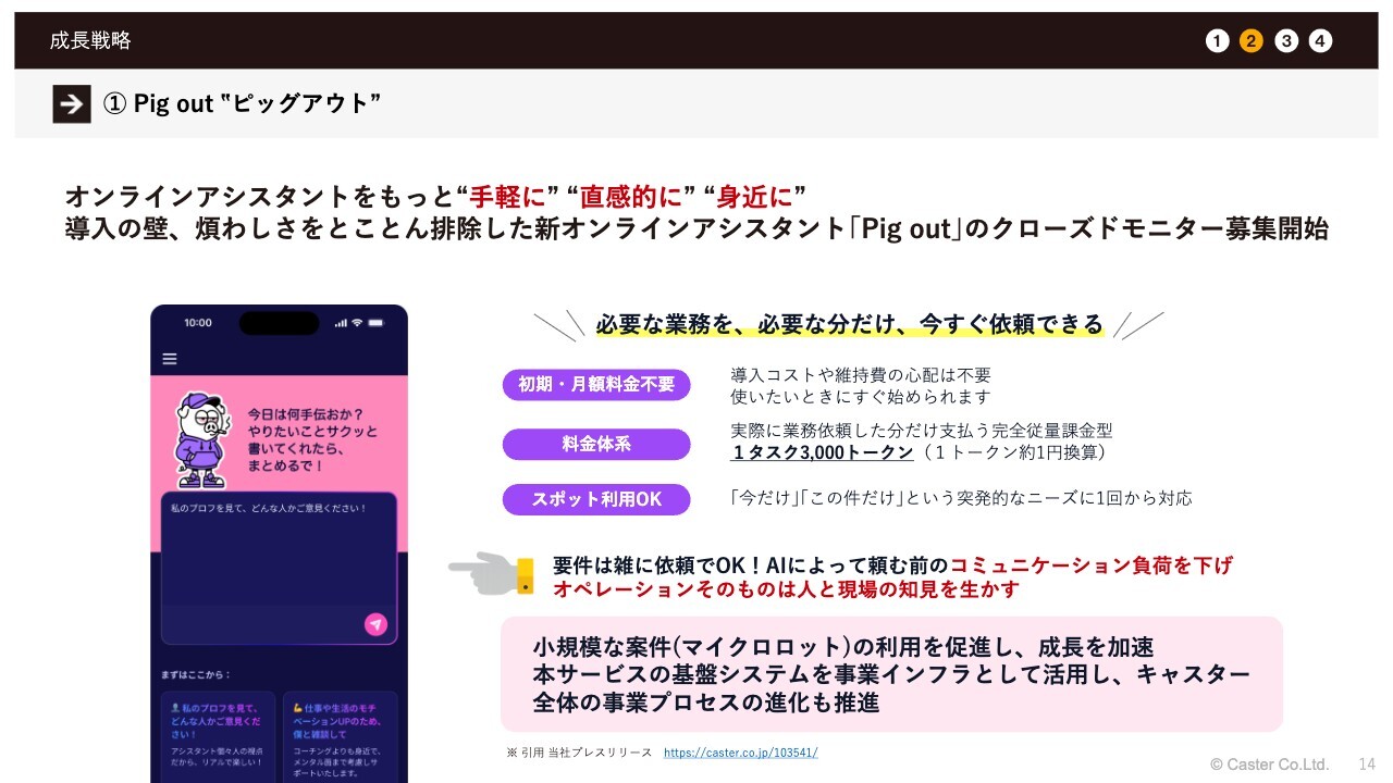 また、すでに株主のみなさまにも開示済みですが、当社の基幹システム「Workforce」の基盤を活用し、外部の企業でもAIを通じて依頼が簡単にできる仕組みをテスト的に開始しています。新サービスの名称は「Pig out」で、これは当社が使用していた業務案件の差配を行うためのディレクションシステムを基盤としています。