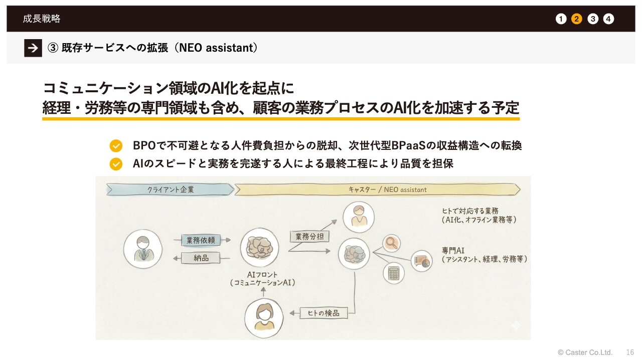 同時に、フロントレスのサービスとして、今後新たな「NEO assistant」を同じ領域で展開していくことになります。こちらはAIがフロントに立つため、従来のサービスとは異なり、KPI構造が変わる予定です。そのため、事業拡大とともにその内容を開示していくことになると考えています。