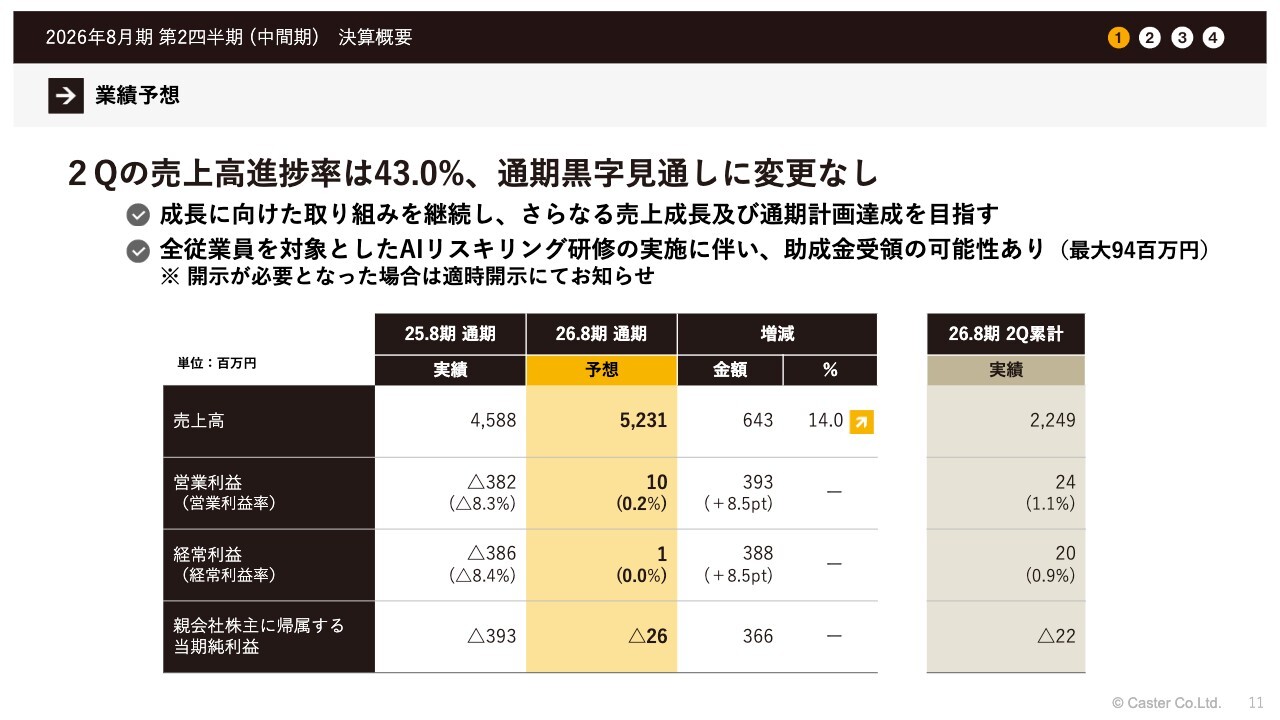 業績予想です。今期の着地に向けて、現時点での売上進捗率は43パーセントとなっています。後半で進捗分がさらに積み上がる見込みであり、この部分を様子見しつつも、通期黒字の見通しに変更はないという認識で進めています。