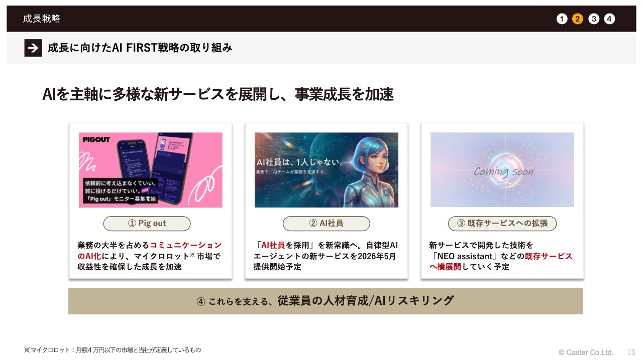 成長戦略です。当社としては現在、経営の方向性としてAIを主軸にさまざまなサービスを展開しながら、実験的な取り組みも繰り返すことで、お客さまに提供できる価値を増やしていくことを目指しています。