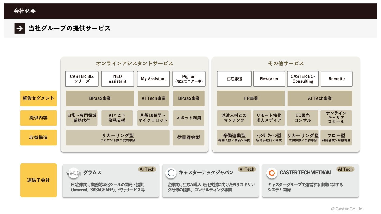 勝見彩乃氏:本日はお忙しい中、当社の決算説明会にご参加いただきありがとうございます。IR担当の執行役員の勝見です。初めて当社の説明会をご視聴いただいている方もいらっしゃるかと思いますので、まず会社概要を簡単にご説明します。
