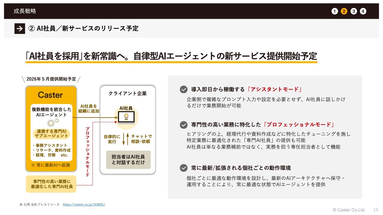 また、5月頃に提供を開始する予定の「AI社員」についてです。当社内で業務に従事している自律型に近いAIエージェントを、外部企業にも提供することで、より幅広いBPOニーズに応えることができると考えています。このようなサービスを提供すべく、準備を進めています。