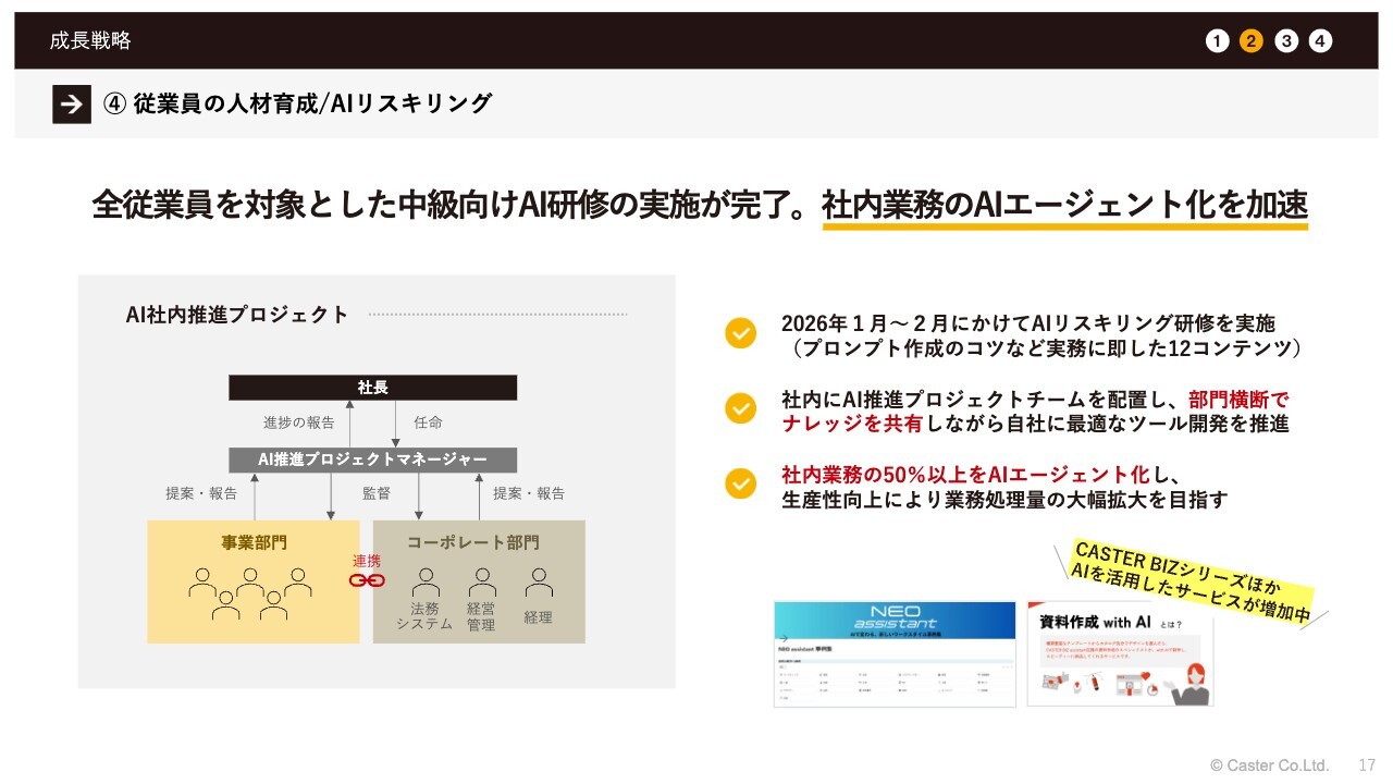 先ほども触れましたが、従業員向けのAI研修は順次行っていきます。この取り組みをさらに強化し、社内業務のエージェント化およびAI化を進めていきたいと考えています。現状、50パーセント以上としていますが、これにとどまらず、業務処理の大幅な効率化を目指します。