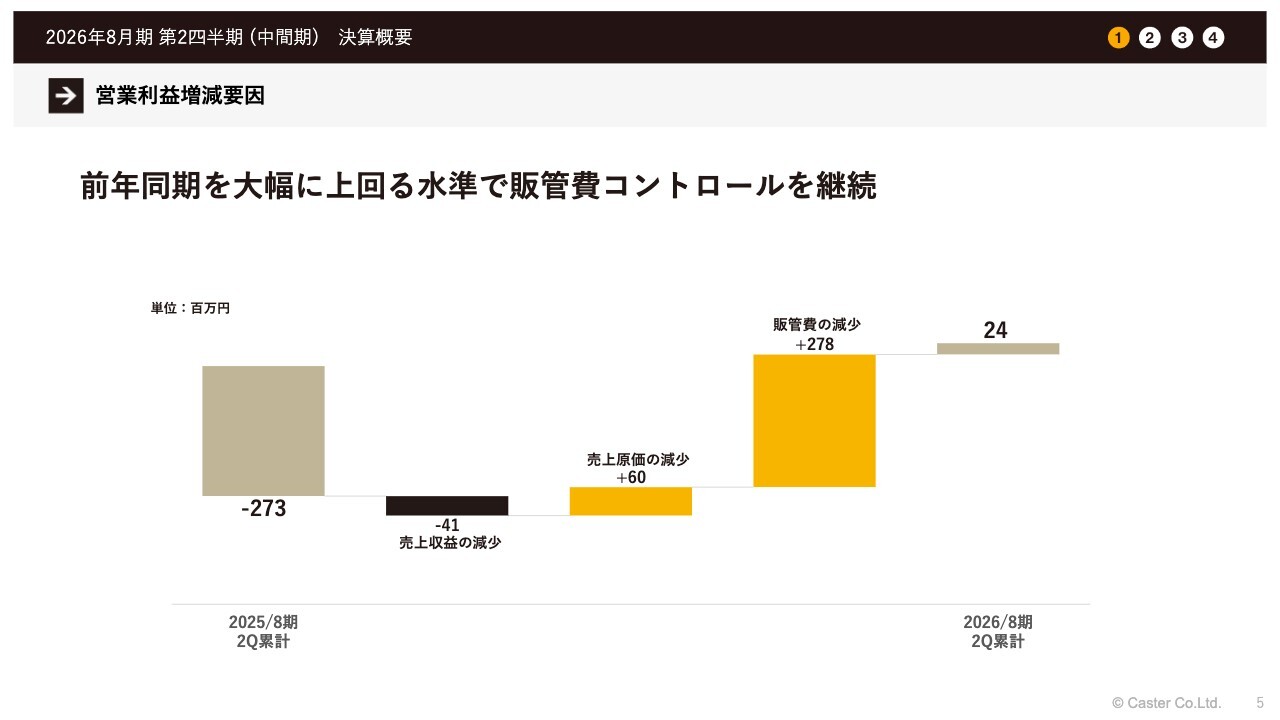 営業利益の減少要因です。販管費などを縮小しつつ全体をコントロールしているため、このような黒字が出ているとお考えいただければと思います。