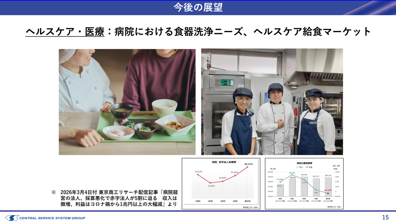 フードサービス事業についても、ヘルスケアや高齢者住宅といった給食マーケットでのサポートに関するお話を多くいただいています。この分野の引き合いが増えて市場が広がりつつあり、1件ずつ着実に実績を増やしています。