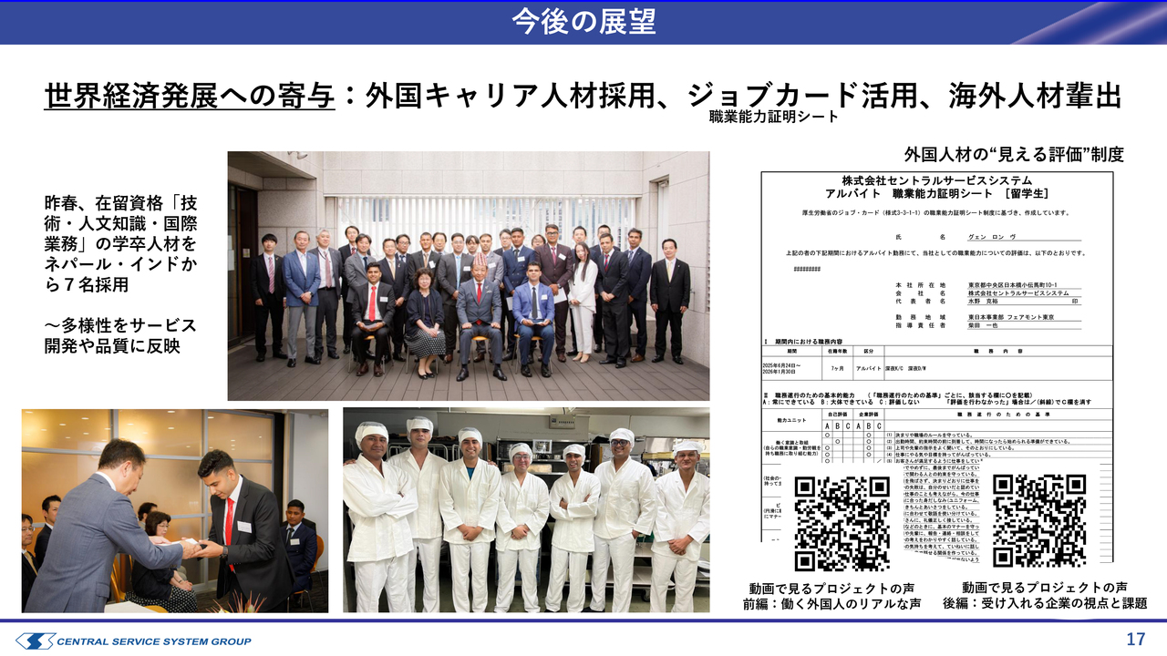 スライド下段の写真に白いユニフォームを着た7名が写っていますが、昨年5月に総合職としてネパールから6名、インドから1名が入社しました。私たちも現地に赴き、面接などを経て7名を採用しました。現在は研修期間を終え、日本語を勉強しながら現場でさまざまなことを学んでいます。このように、外国人キャリア人材の採用を進めています。