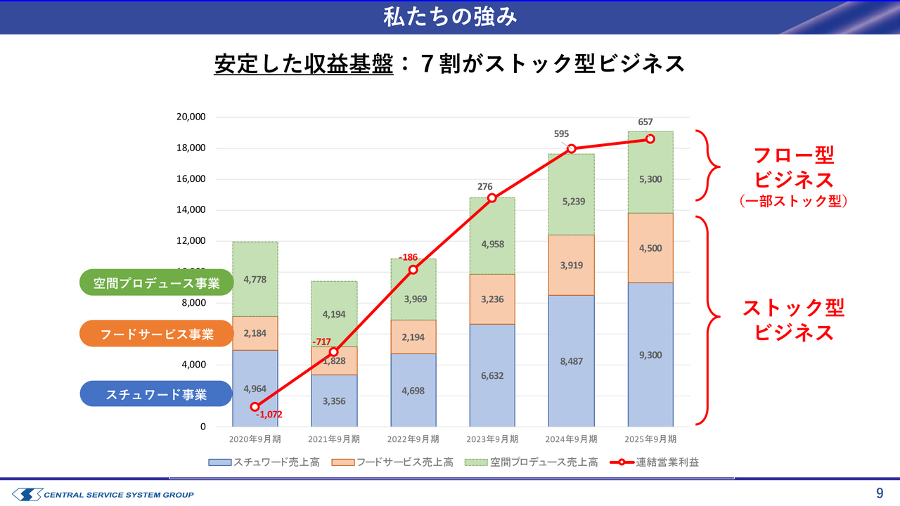 一番大きな強みは、安定した収益基盤です。先ほどの3セグメントのうち、スチュワード事業とフードサービス事業が全体売上の約7割を占めていますが、これらがストック型ビジネスであるという点が当社の最も特徴的な部分です。