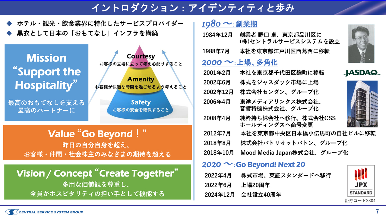 歴史的には40年間、お皿を洗う業務を中心に歩んできましたが、創業から20年が経過した時点でJASDAQに上場し、そこから多角化を図りました。具体的には、先ほどご紹介したフードサービス事業や空間プロデュース事業を展開し、グループ経営を開始しています。