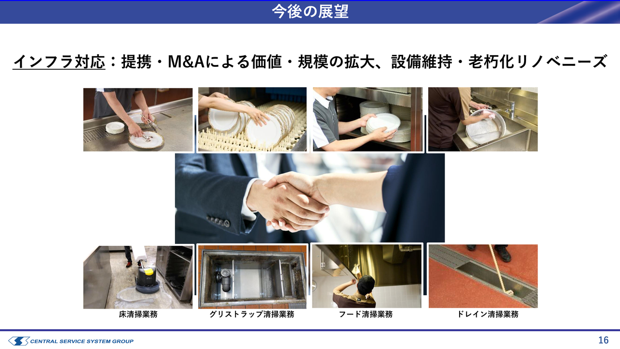 こちらに対しては、当社で対応可能な業務だけでなく、M&Aや提携によって業務の幅を広げる取り組みを進めています。スライドでいくつか例を示しており、上段は食器洗浄に関わる工程を、下段はその他の業務の一例を示しています。