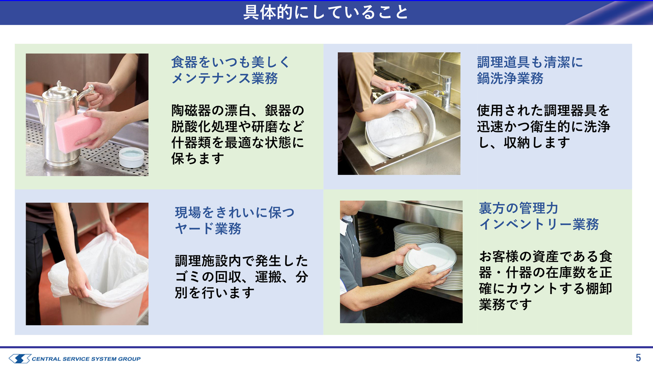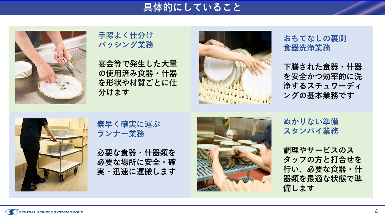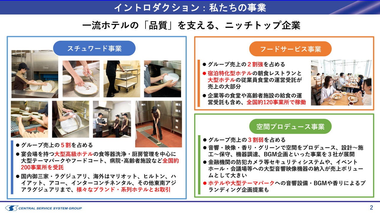 1つ目は、スライドに青色で枠囲みされたスチュワード事業です。少し耳慣れない言葉かもしれませんが、グループの売上収益の半分を占めています。この事業はホテルのバックヤードで主に食器の洗浄を行うもので、当社は40年以上にわたり提供しています。