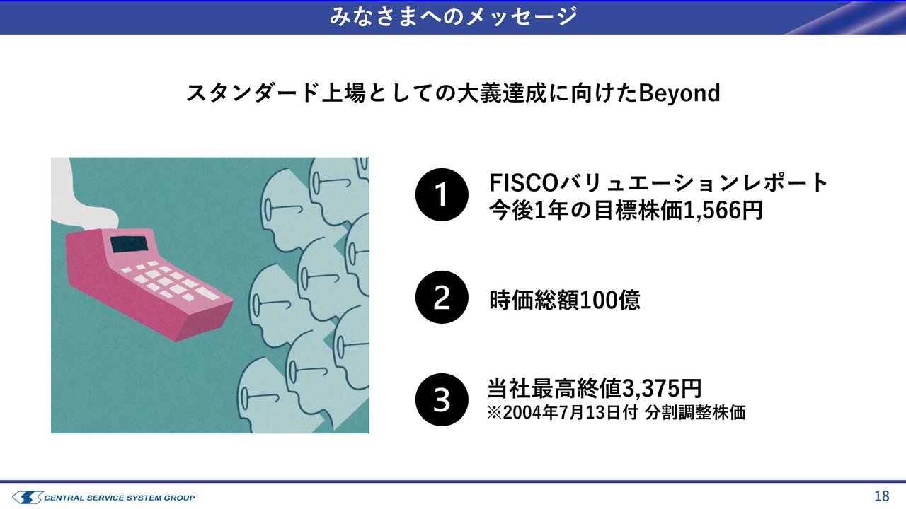 最終的に当社の歴史を振り返ると、これまでに複数回の株式分割を行っていますが、それを調整すると、上場2年目に最高株価3,375円を記録しています。これを高い目標として掲げ、みなさまに当社の成長余力をどこまで評価いただけるかを中心に、積極的にコミュニケーションを図り、アピールしていきたいと考えています。