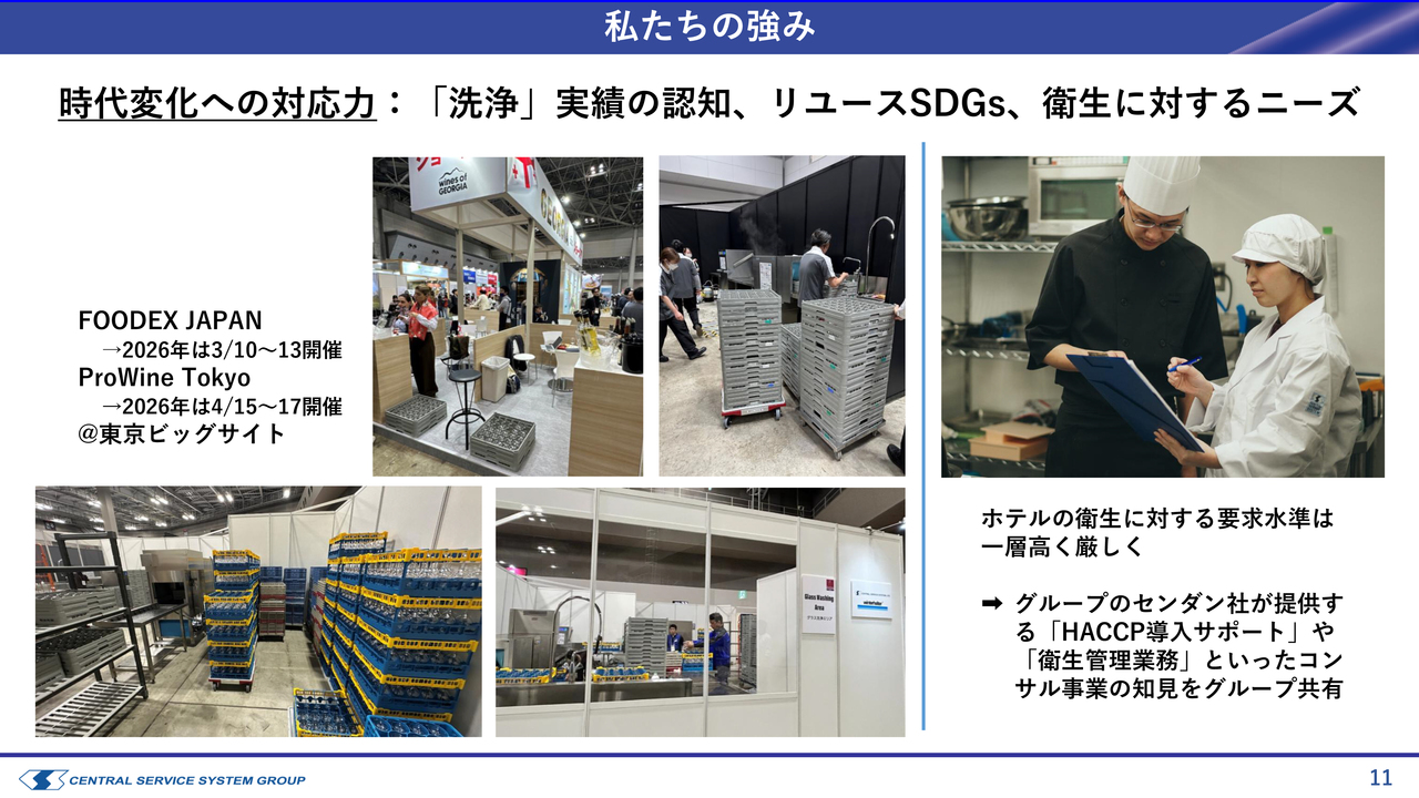 こうした分野において、当社グループの中核となるセントラルサービスシステムという事業会社は、非常に高い認知度を有しています。「食器 洗浄」などの単語で検索すると当社の名前が表示され、ホームページへのアクセス機会も多い状況にあります。このように、40年来の実績が私たちの強みになっていると考えています。