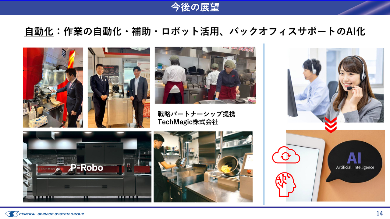 スライド中央上段の写真にあるように、実際に大阪・関西万博の会場内で当社が調理サポートを受託しているキッチンにおいて、TechMagic社が提供する調理ロボットが導入されました。これらを一緒に活用しながら、生産性向上に向けた取り組みを進めています。